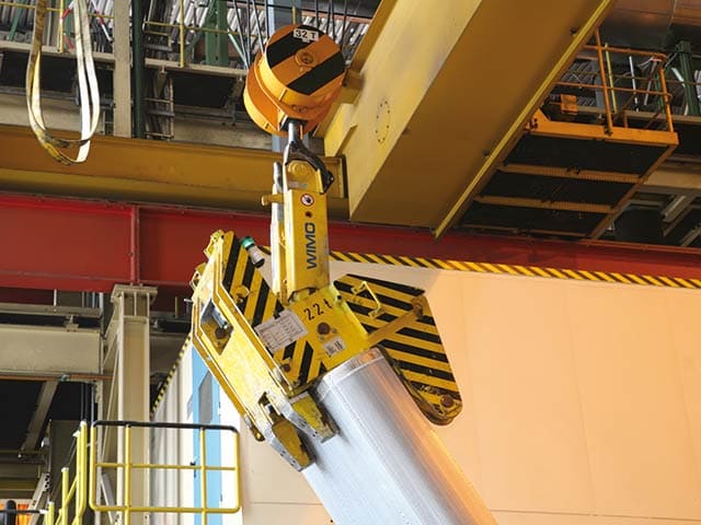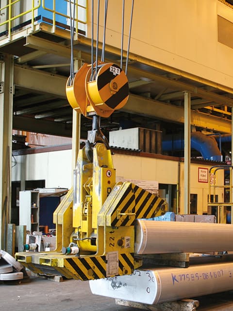 “Slabs” – large blocks of cast steel, copper or aluminium – are often transported in ironworks, aluminium smelters and steelworks in particular. Slab tongs from WIMO® make slab transportation quick and safe.