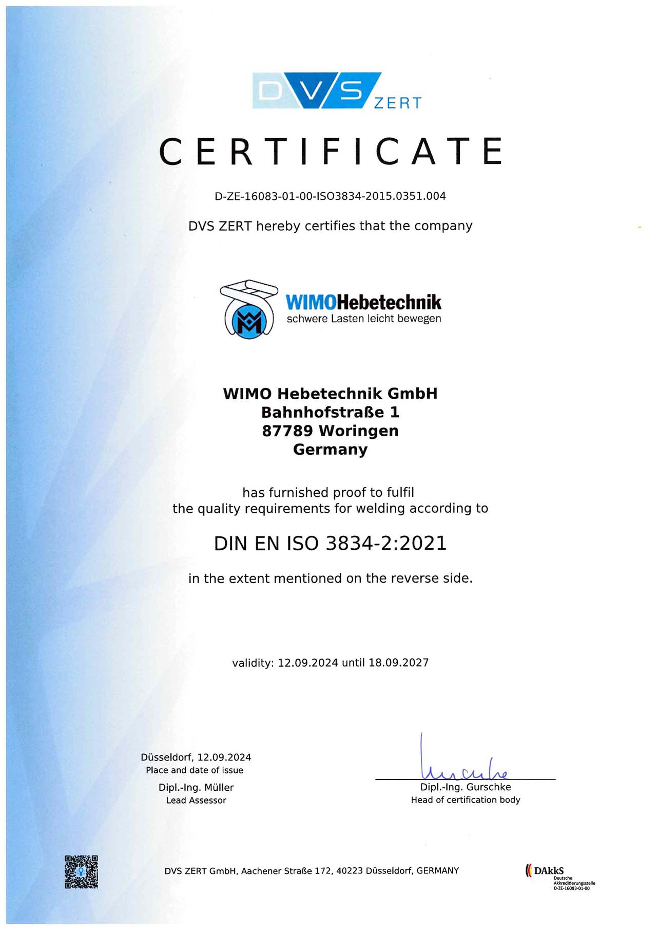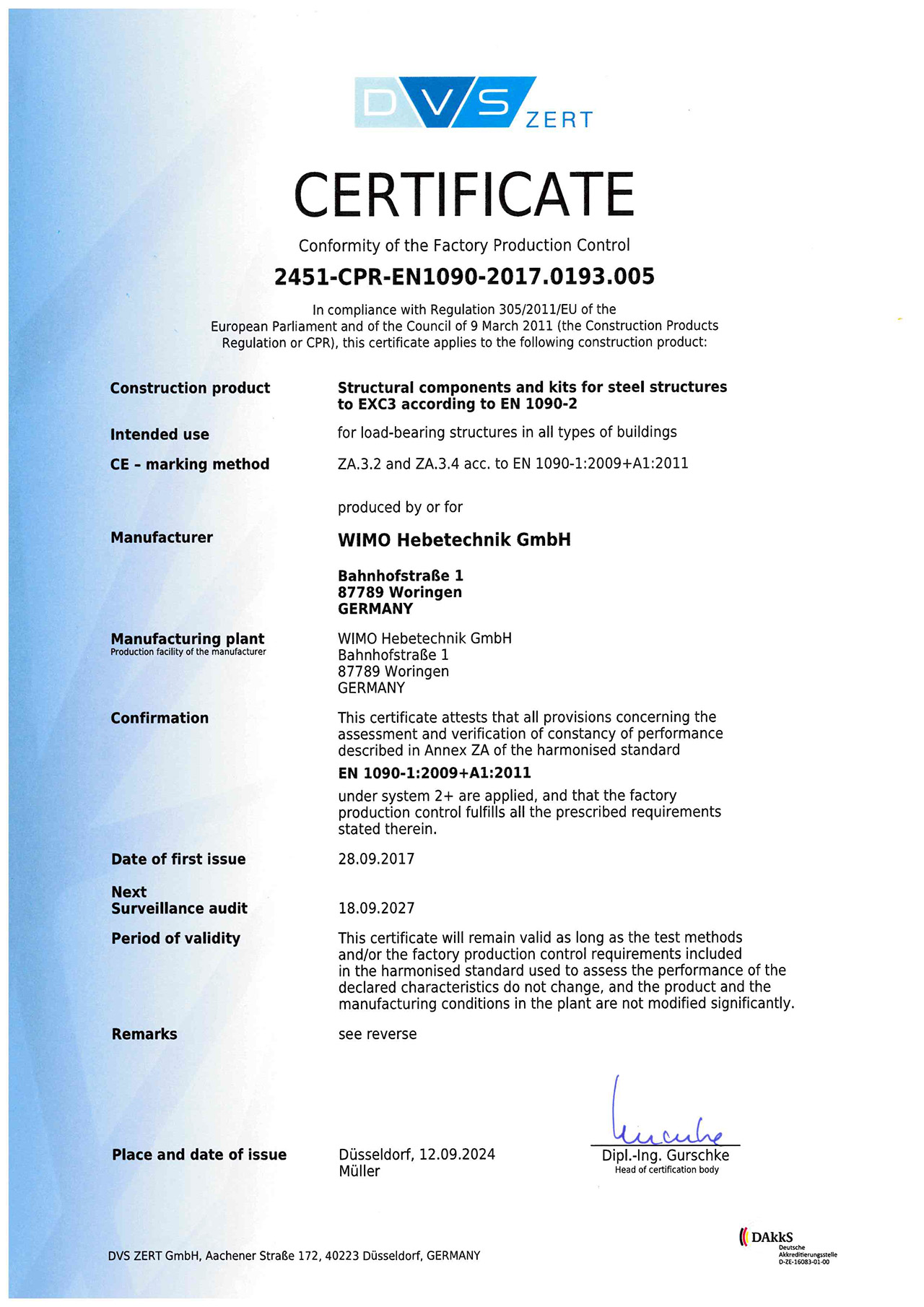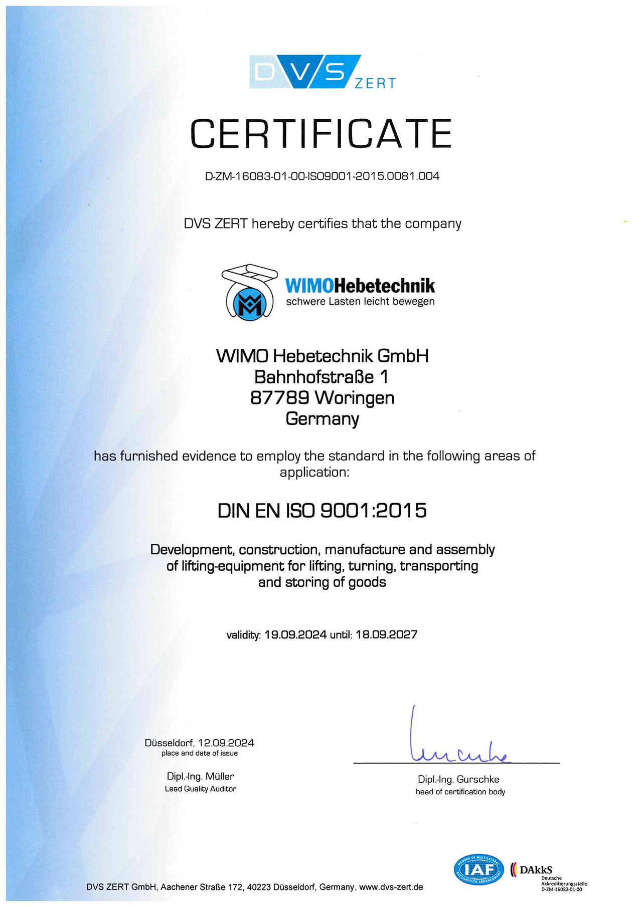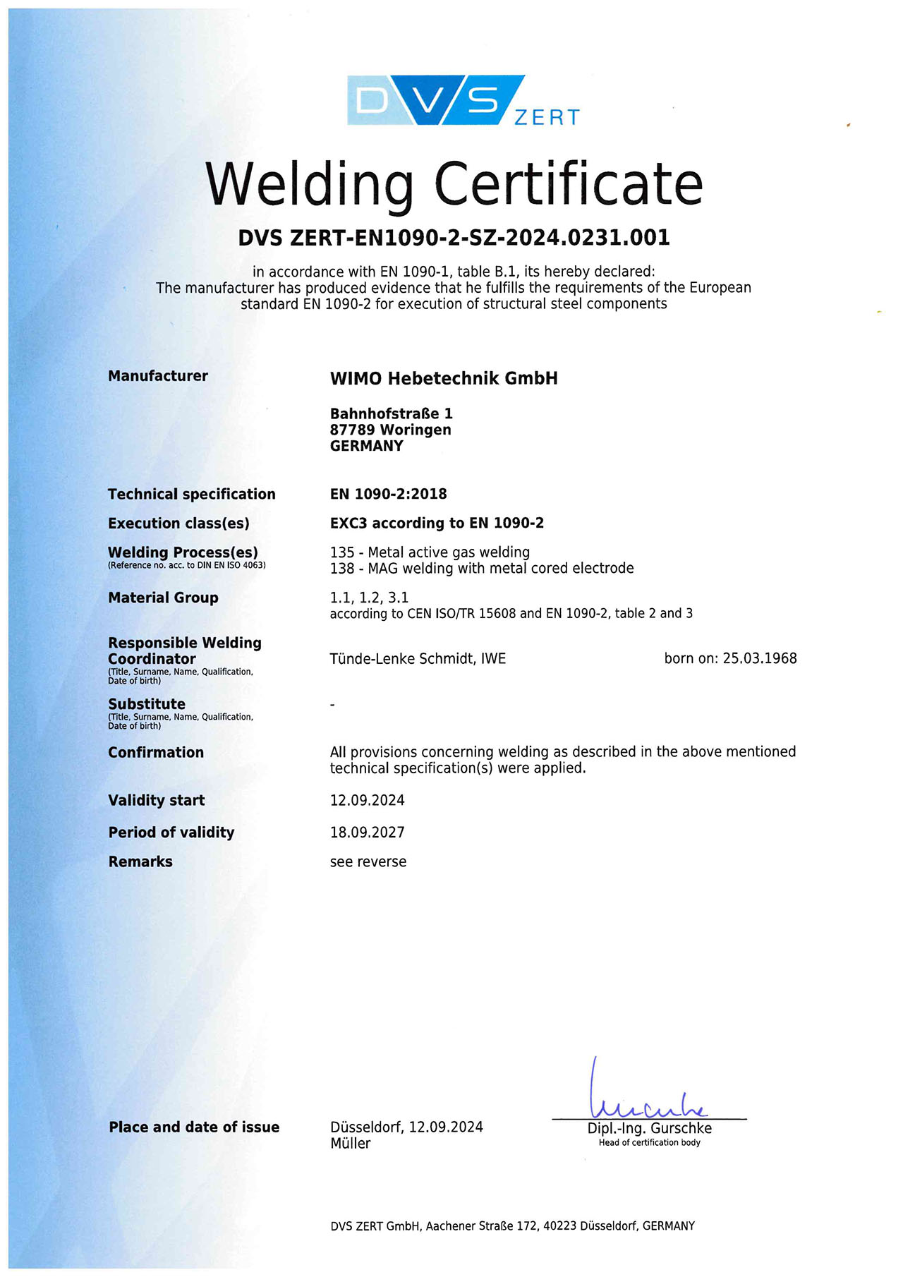 We have also integrated a comprehensive quality management system that accompanies our operational processes from development to design and assembly. As such, WIMO Hebetechnik is certified in accordance with DIN EN ISO 9001:2015. We hold additional certification and authorisations, such as a certificate of conformity of factory production control for load-bearing components and construction sets for steel supporting structures up to EXC3 in accordance with EN 1090-2, a welding certificate for steel supporting structures in accordance with EN 1090-2:2018, execution class EXC3 or re-stamping certification for certified materials.